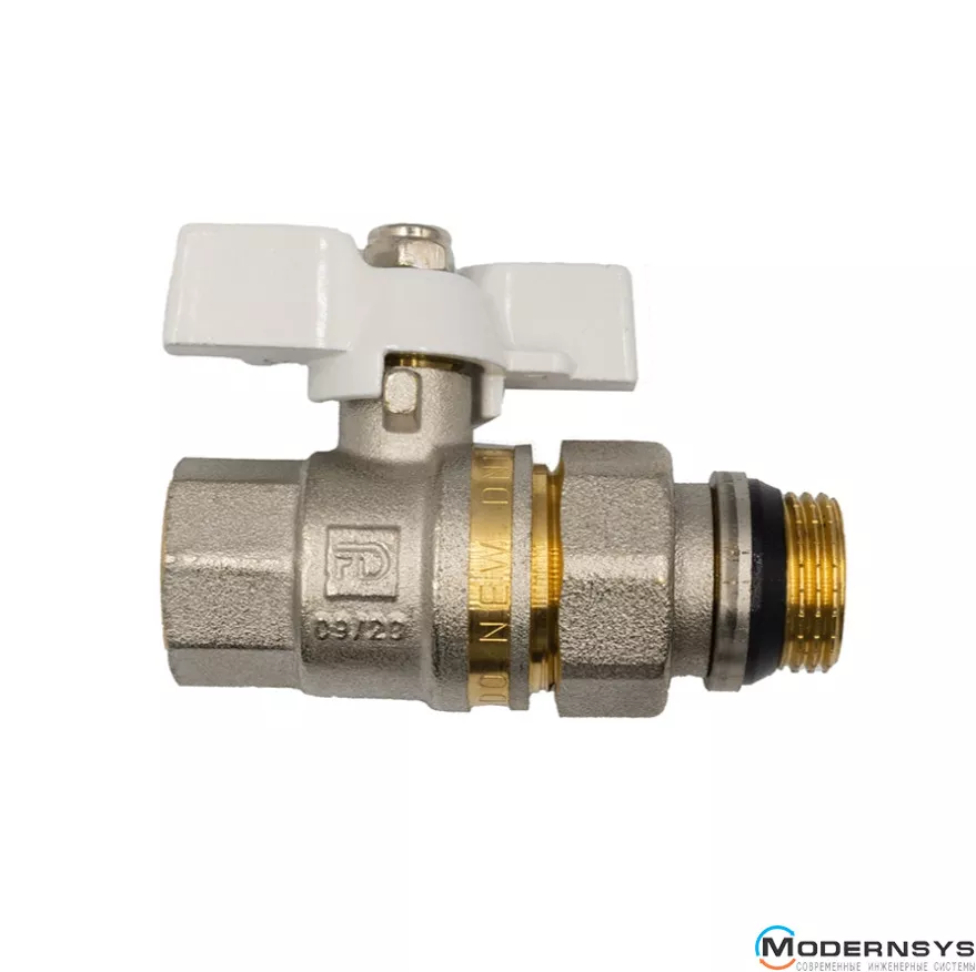 Кран шаровой FADO New с американкой, белая бабочка - полнопроходной ремонтопригодный шаровой кран с повышенным ресурсом. Соединен накидной гайкой с резьбовым полусгоном. Полусгон оснащен уплотнительным кольцом из EPDM. Корпус латунный, никелированный. Ручка типа "бабочка" белого цвета из алюминия. Резьба присоединения - внутренняя / внешняя.