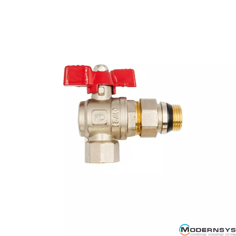 Кран шаровой FADO New с американкой угловой - полнопроходной ремонтопригодный шаровой кран с повышенным ресурсом. Соединен накидной гайкой с резьбовым полусгоном. Полусгон оснащен уплотнительным кольцом из EPDM. Корпус латунный, никелированный. Ручка типа "бабочка" из алюминия. Резьба присоединения - внутренняя / внешняя.