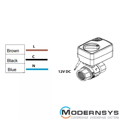 Кран с электроприводом состоит из крана латунь CW617N и электропривода 12В постоянного тока. В электроприводе находится кнопка ручного открытия/закрытия крана. Управление работой электропривода производится с использованием трех проводов: коричневый, черный и голубой. Ручной переключатель использовать только при обесточенном электроприводе. В противном случае вы можете повредить механизм электропривода.