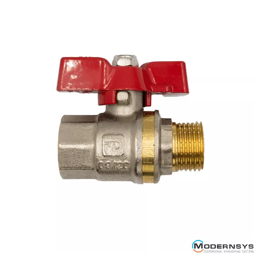 Кран шаровой FADO New ЗВ - полнопроходной ремонтопригодный шаровой кран с повышенным ресурсом. Корпус латунный, никелированный. Ручка типа "бабочка" из алюминия. Резьба присоединения - наружная / внутренняя