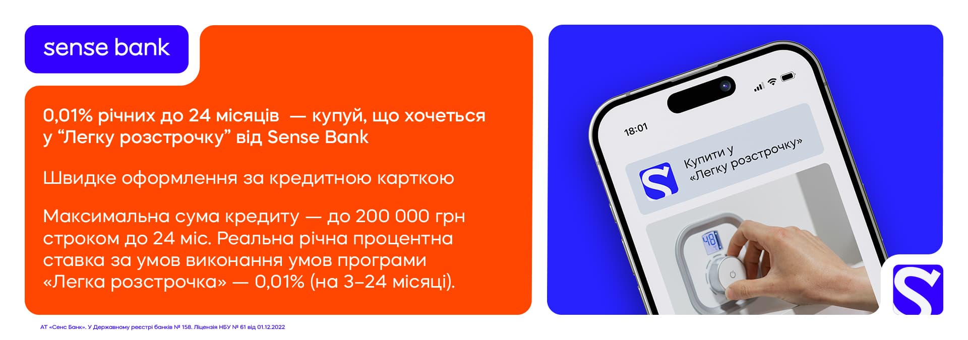- Если Клиент воспользовался Программой «Легкая рассрочка», реальная годовая процентная ставка составляет 0,01% (на срок от 3 до 24 месяцев). Например: при оформлении рассрочки по Программе «Легкая рассрочка» сроком 6 месяцев с суммой 6 000 грн. платеж составляет 1000,03 грн. на месяц. Ежемесячная комиссия от суммы рассрочки — 0,00% сроком на 6 месяцев. Подробные условия предоставления финансовых услуг и пример расчета реальной процентной ставки на сайте Sense Bank