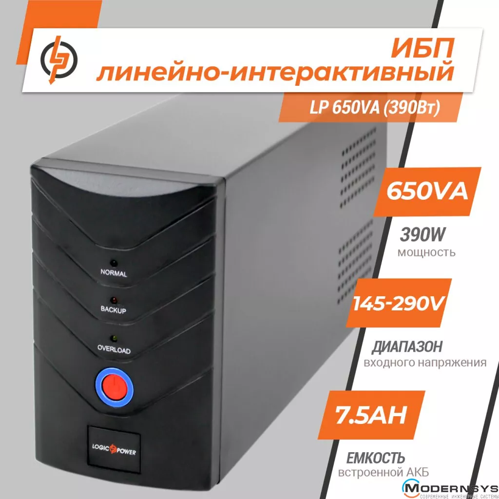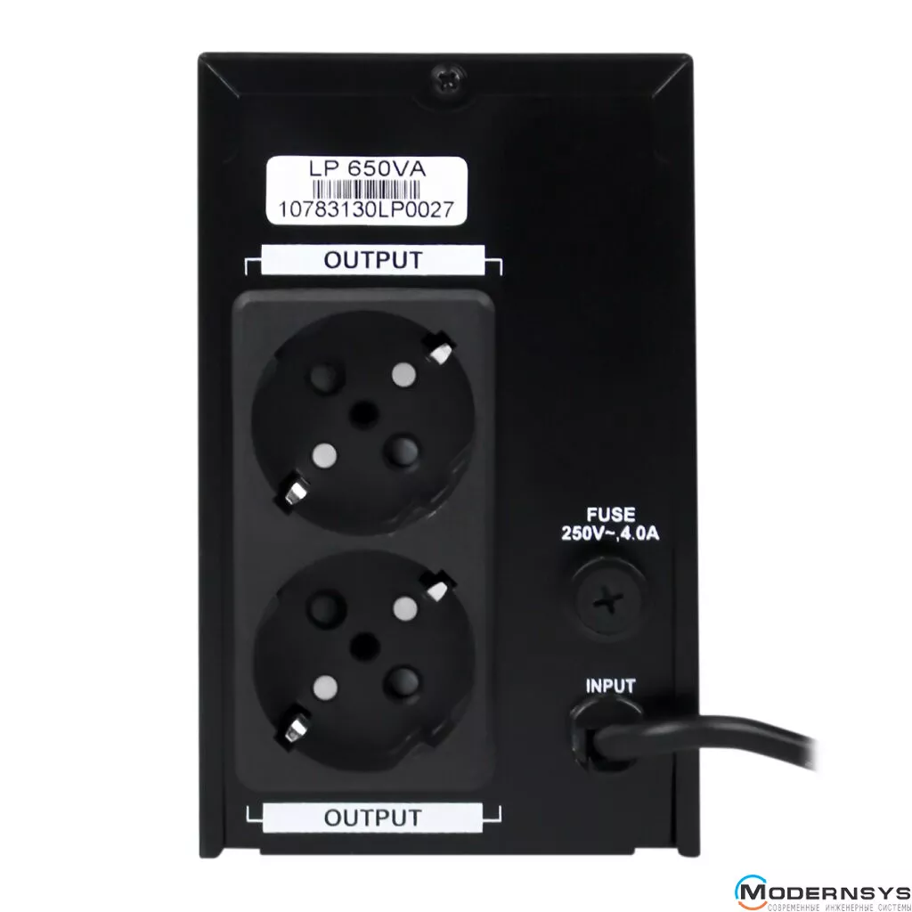 Бесперебойный UPS LP 650VA (линейно интерактивный тип) имеет показатели мощности 650/390 VA/W и входное напряжение 145-290 V. Защитный функционал интерактивного источника бесперебойного питания ИБП LP-650VA (390Вт) подразумевает: защиту от короткого замыкания, скачков напряжения, перегрузки, разряда и избыточного заряда батарей. Автоподзарядка устройства выполняется в выключенном состоянии. Имеет 2 евророзетки, функции холодного старта и повторного запуска при восстановлении напряжения в сети.