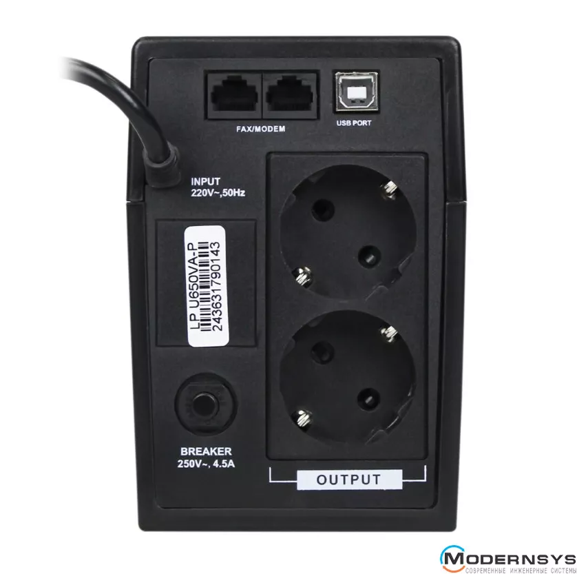 LPM-U650VA-Р подключается к сети при помощи стандартной евровилки. Для подключения электрических приборов внешняя сторона корпуса UPS оборудована евророзеткой. Модель подключается к персональному компьютеру через USB.