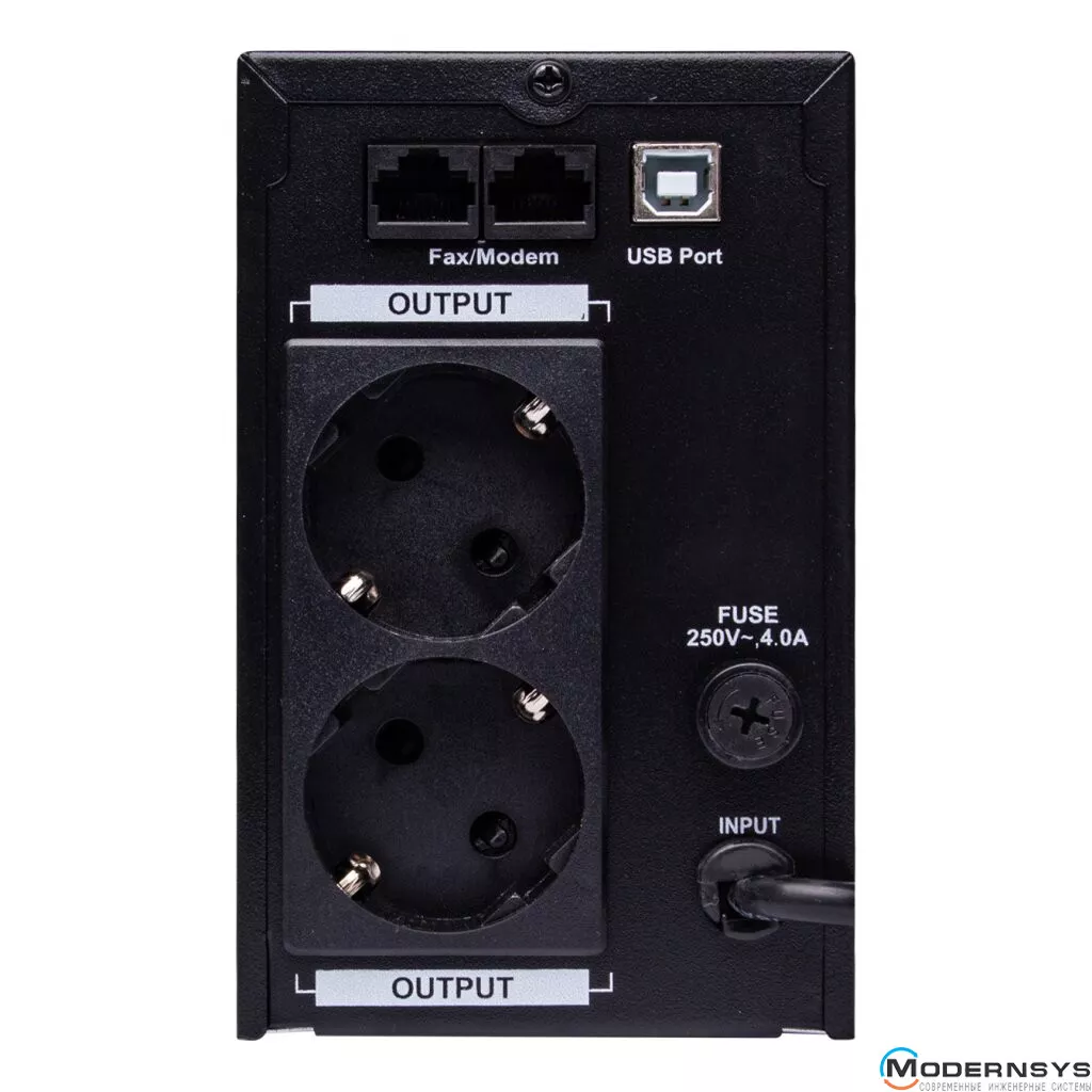 Тип подключения к сети – евровилка. Для подсоединения электрических приборов внешняя сторона корпуса ИБП/UPS LPM-U825VA оборудована двумя розетками европейского типа. Интерфейс подключения к персональному компьютеру – USB.