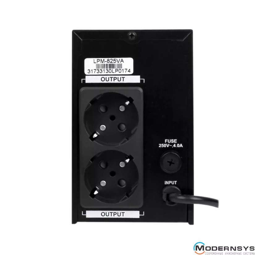 ИБП LPM-825VA подсоединяется к сети питания электрическим током при помощи евровилки. Внешняя сторона корпуса оборудована двумя розетками европейского типа, для подключения электрических приборов.
