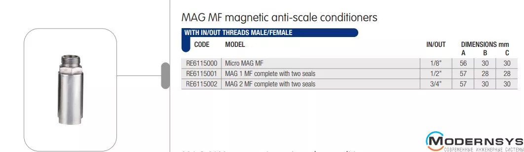 Название товара КОД Диаметр резьбы Цена Магнитный противонакипной фильтр Atlas Filtri MAG 1 MF 1/2" 10 bar 90°C 0000706531 224 грн Магнитный противонакипной фильтр Atlas Filtri MAG 2 MF 3/4" 10 bar 90°C 0000706541 224 грн