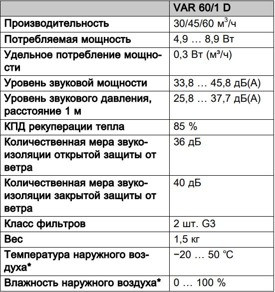 Технические характеристики: Модуль приточно-вытяжной вентиляции Vaillant (Вайлант) VAR 60/1 D с рекуперацией тепла. 60 м3 / час. (0010025515)