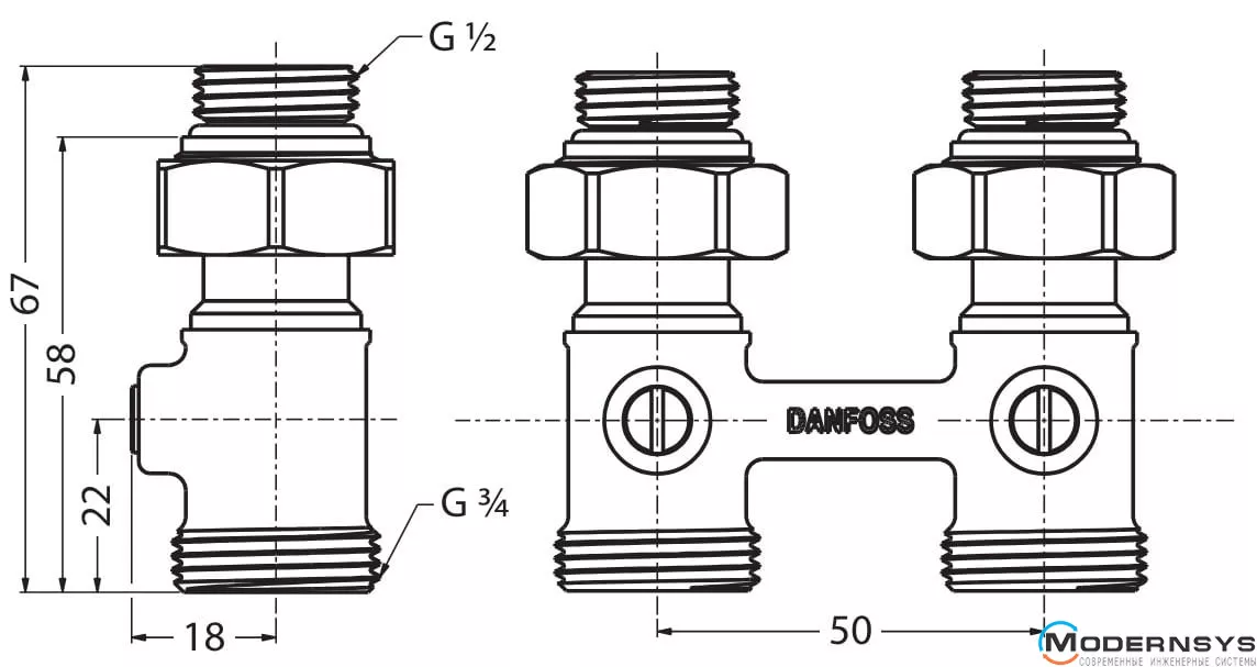 - Для присоединения к отопительным приборам с внутренней резьбой G 1/2 и наружной резьбой G 3/4.