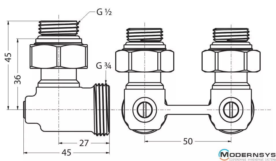 - Для присоединения к отопительным приборам с внутренней резьбой G 1/2 и наружной резьбой G 3/4.