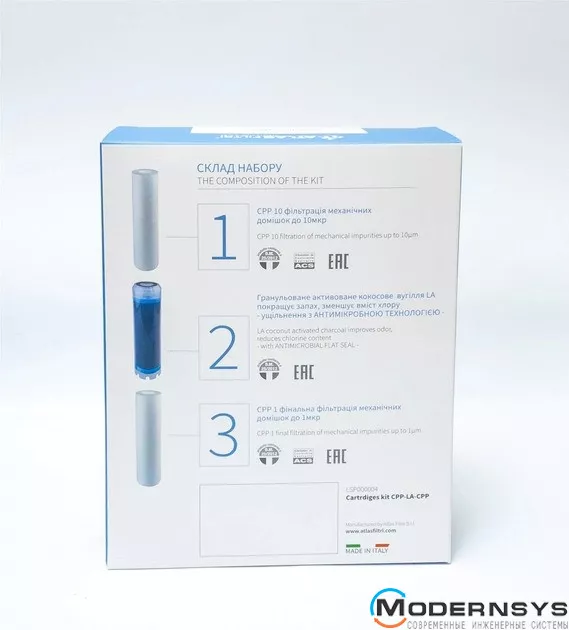 Набор картриджей для систем обратного осмоса и проточных фильтров производства фирмы Atlas Filtri. В набор входят 3 картриджа для очистки воды от различных загрязнений. Все картриджи производятся в Италии, отвечают строгим санитарным нормам и сертифицирован NSF. Картриджи полностью совместимы с любыми фильтрами размера 10”.