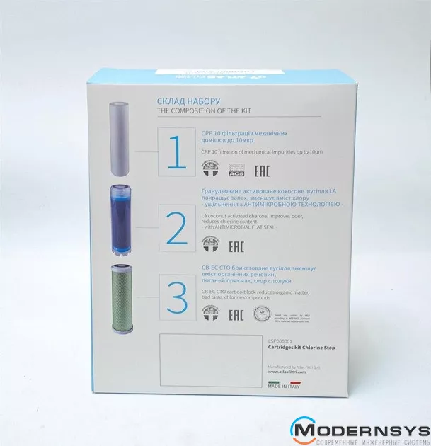 Технические характеристики: Набор Картридж Atlas Filtri (Атлас Фильтры)в для тройных систем NEW! ХЛОР СТОП (CPP+LA+CB CTO) Srl