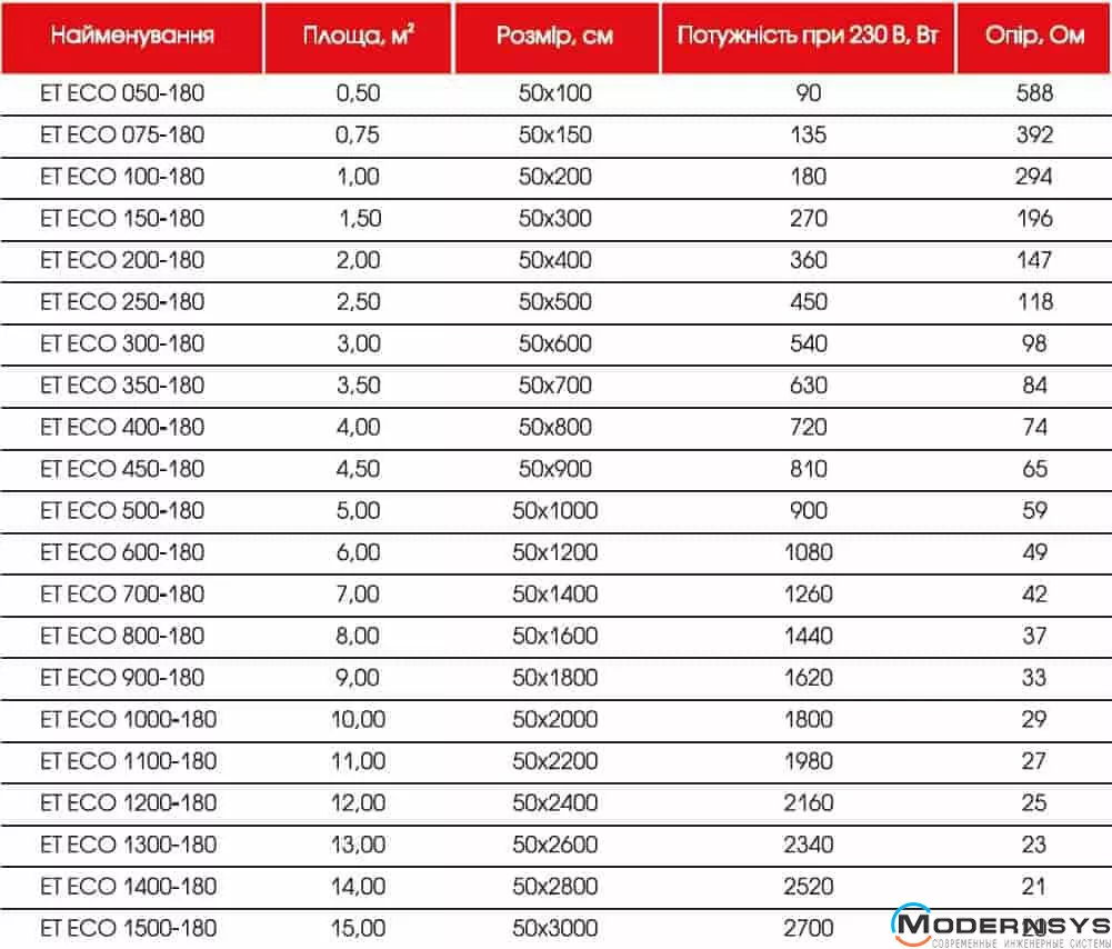 Технические характеристики: Нагревательный мат двухжильный Extherm (Екстерм) ET ECO 250-180