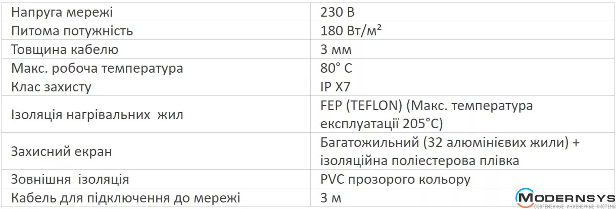 Удельная мощность 180 Вт на один квадратный метр. Класс защиты IPX7. Длина сетевого шнура питания 3 метра. Данные должны иметь защитный экран (алюминиевая фольга + провод 1х0,5мм), тефлоновую изоляцию греющих жил, дополнительную и наружную изоляции. Соответствует сертификатам международного уровня – BEAB, IEC, VDE, CE.