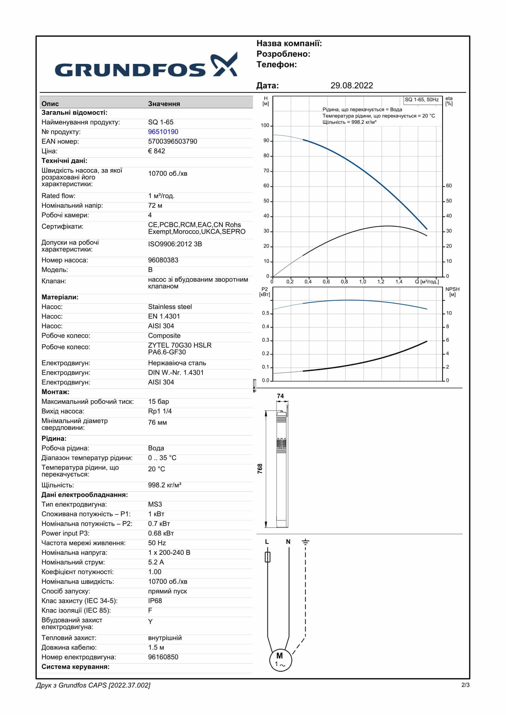 Технические характеристики: Насос погружной Grundfos (Грундфос) SQ1-65 0,7кВт 220-240В