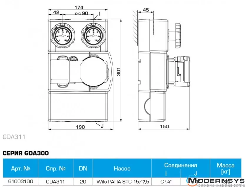 Технические характеристики: Насосная группа ESBE (Эсби) GDA311 DN20 прямая с энергоэффективным насосом WILO Yanos para RKА 15/7.5 (снят)