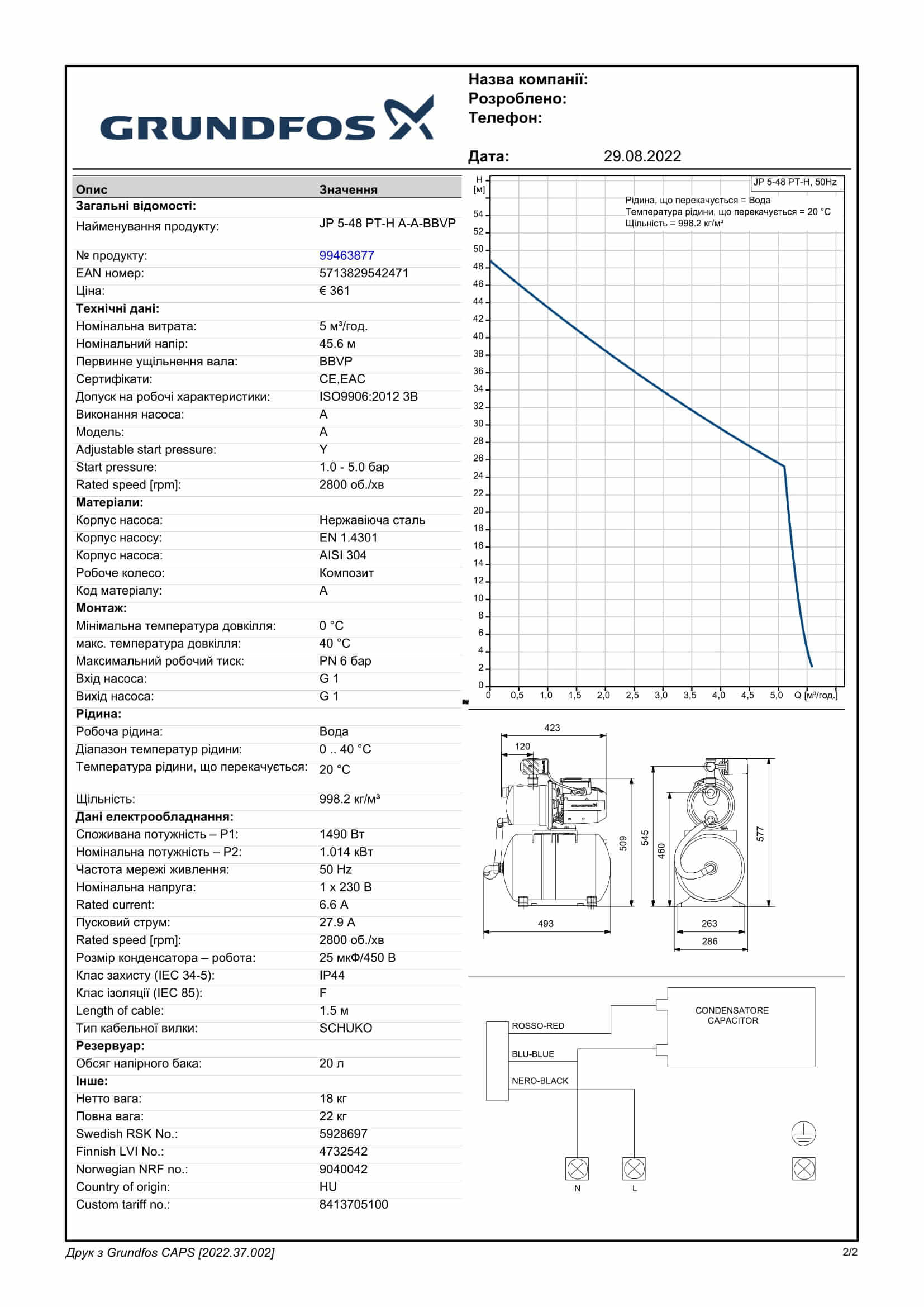 Технические характеристики: Насосная станция Grundfos (Грундфос) JP 5-48 PT-H 1x230V 1,5м 20 л