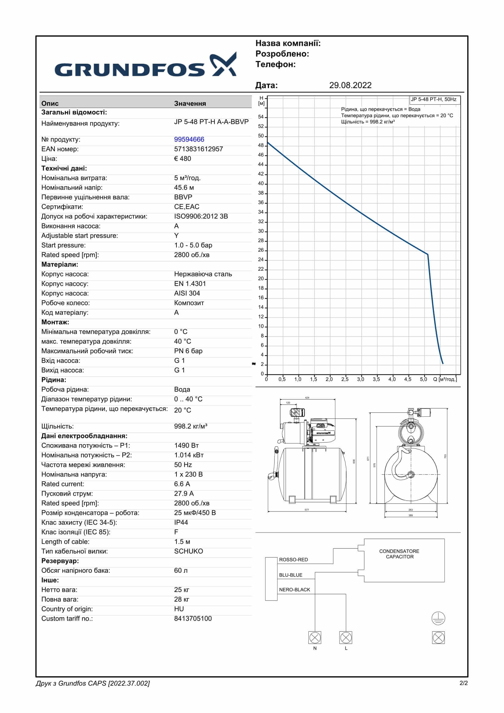 Технические характеристики: Насосная станция Grundfos (Грундфос) JP 5-48 PT-H 60L 230V 60 л