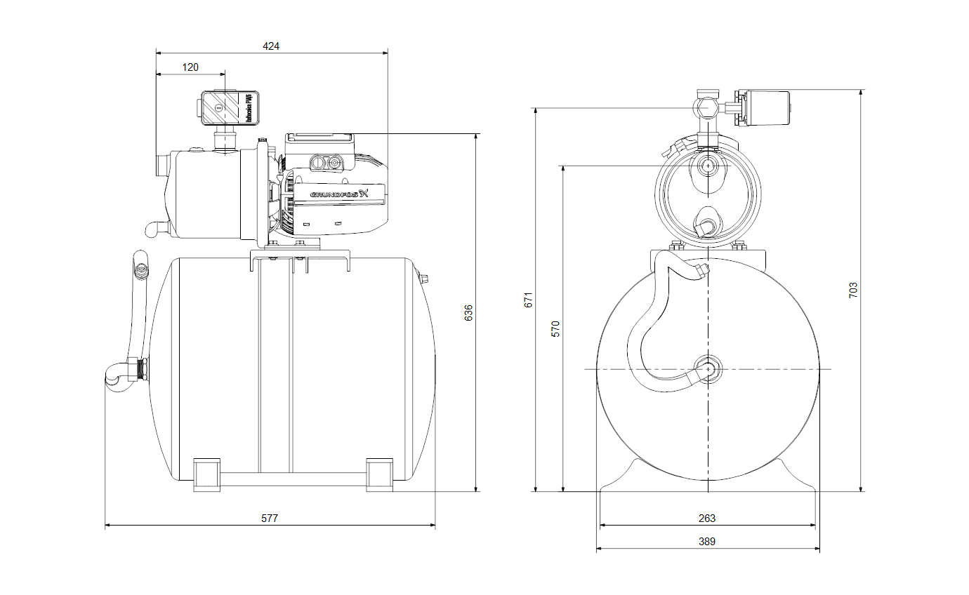 Grundfos JP 5-48 PT-H включает насос Grundfos JP, реле давления, датчик давления и горизонтальный мембранный напорный бак Grundfos GT-H объемом 20 литров. Эта установка повышения давления имеет напорные отверстия, что упрощает монтаж, а также напорный бак, снижающий риск гидроудара в трубопроводной системе.