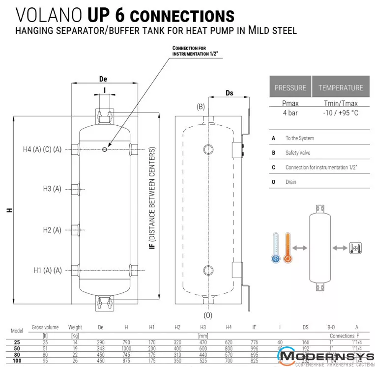 Технические характеристики: Навесной тепло-хладоаккумулятор 100 л Cordivari (Кордивари) VOLANO UP GBF (6 CONN.) 4 bar -10/+95 °C