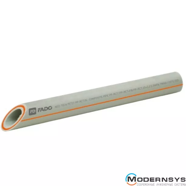 Труба FADO PP-RCT армированная стекловолокном - полнопроходная ремонтопригодная труба армированная стекловолокном с повышенным ресурсом. Материал полипропилен Максимально допустимое рабочее давление при температуре теплоносителя 90 °С - 6 бар, при транспортировке холодной воды - 20 бар. Технология монтажа трубопроводов - полифузионная сварка.