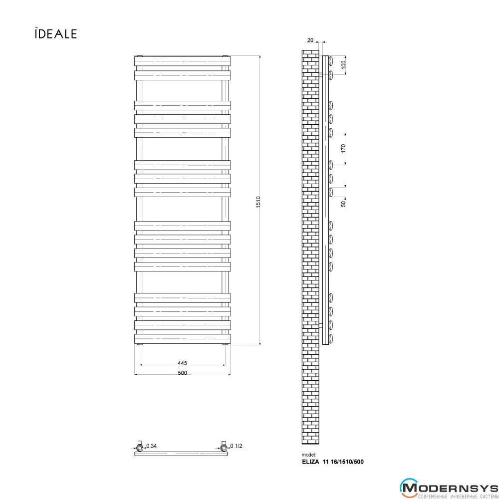 Технические характеристики: Полотенцесушитель дизайнерский Ideale Eliza 11 16/1510/500 белый