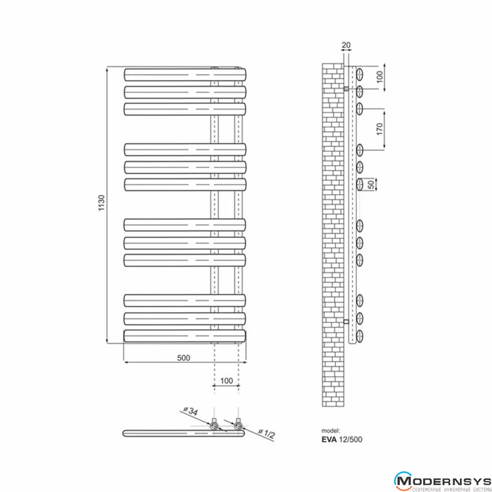 Технические характеристики: Полотенцесушитель дизайнерский Ideale Eva 11 12/1130/500 антрацит