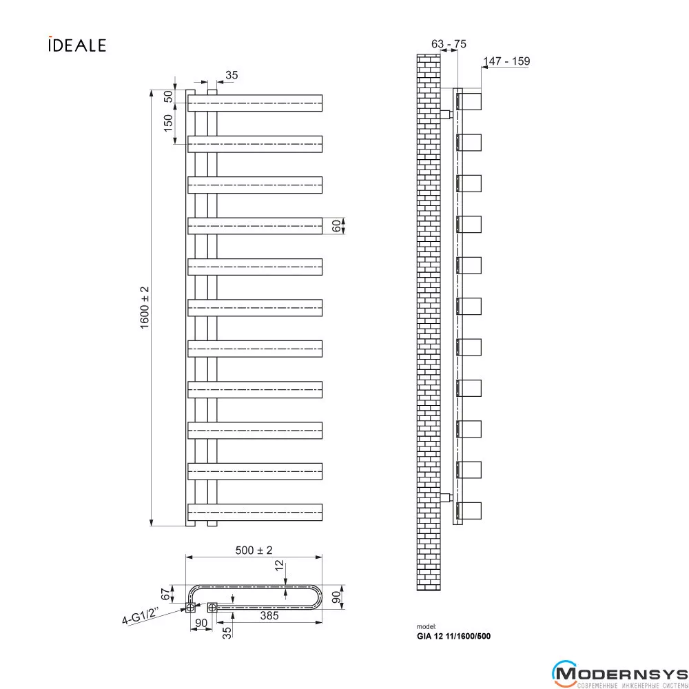 Технические характеристики: Полотенцесушитель дизайнерский Ideale Gia 11 11/1600/500 антрацит