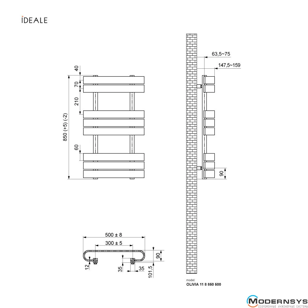 Технические характеристики: Полотенцесушитель дизайнерский Ideale Olivia 11 8/850/500 синий
