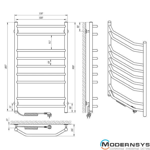 Весь полотенцесущитель изготовлен из высококачественной полированной нержавеющей стали AISI304. Блестящая поверхность изделия превосходно гармонирует с хромированной сантехникой, зрительно расширяя пространство, делая ванную комнату больше и светлее. Прибор оснащён евровилкой и скрученным кабелем питания предотвращающим провисание. Обращаем Ваше внимание, шнур питания расположен с левой стороны полотенцесушителя.