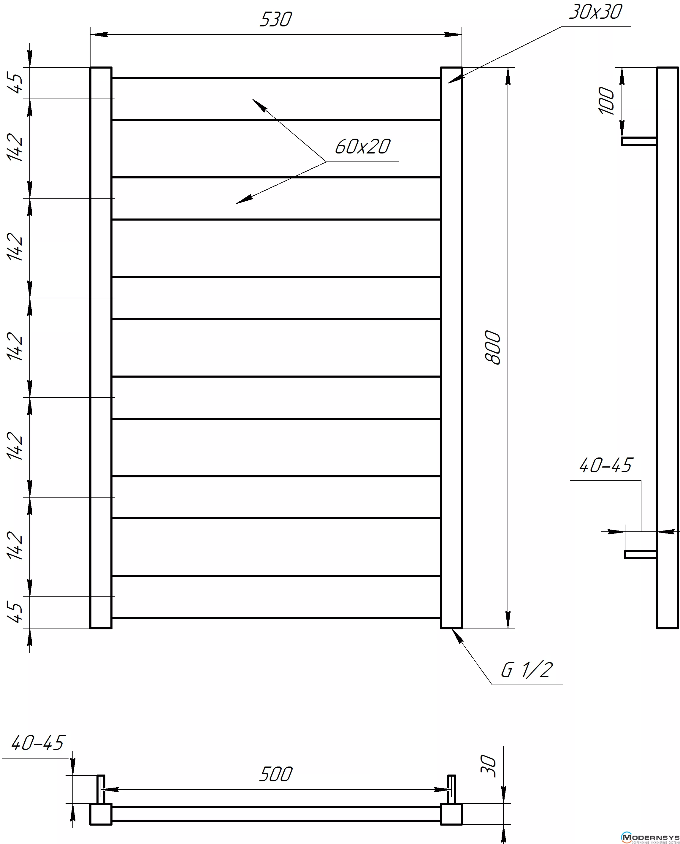 Технические характеристики: Полотенцесушитель Genesis-Aqua (Генезис Аква) BULL 1200x530 черный
