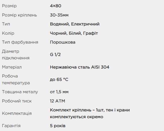 - Комплект креплений - 1 шт., тэн и краны комплектуются отдельно.