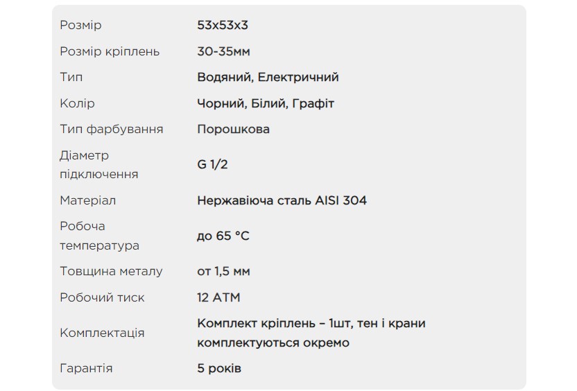 - Комплект креплений - 1 шт., тэн и краны комплектуются отдельно.