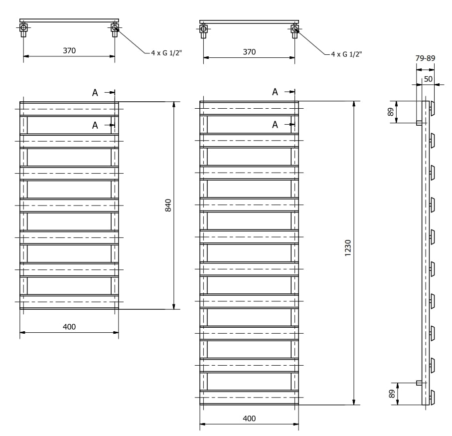 Технические характеристики: Полотенцесушитель Luxrad (Люксрад) Scala NEW 840х500х79-89 (373 Вт) белый RAL 9003