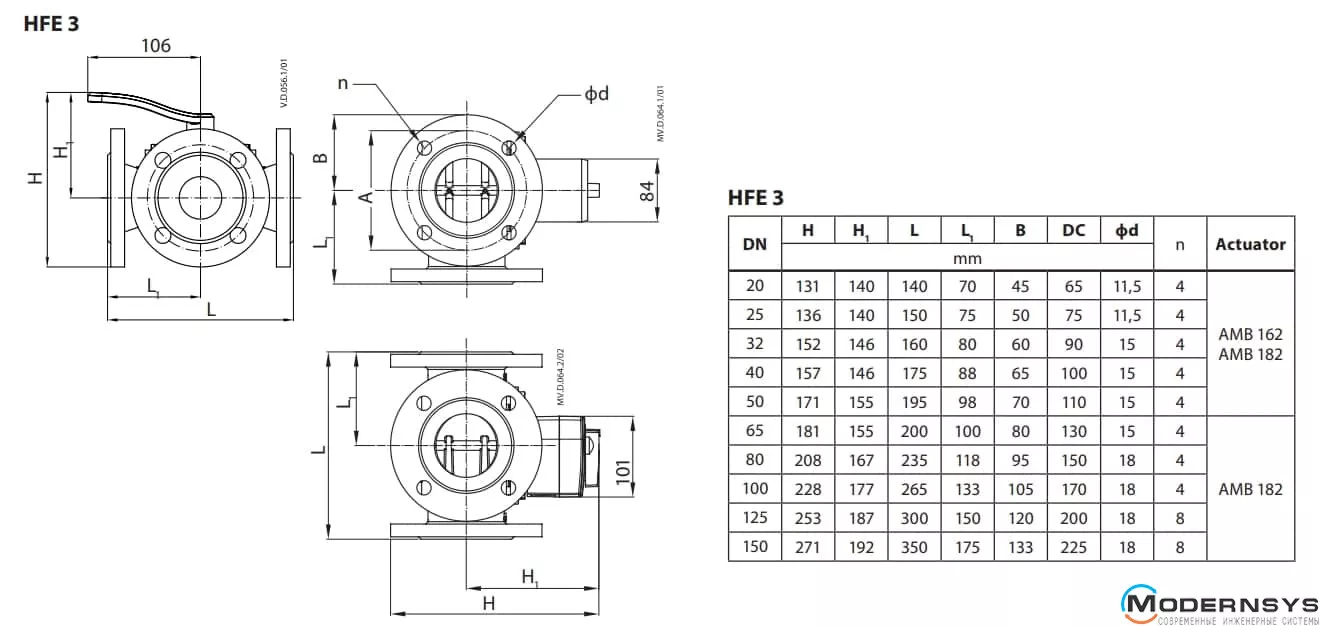 Технические характеристики: Поворотный трехходовой клапан Danfoss (Данфос) HFE3 PN6 DN50/60
