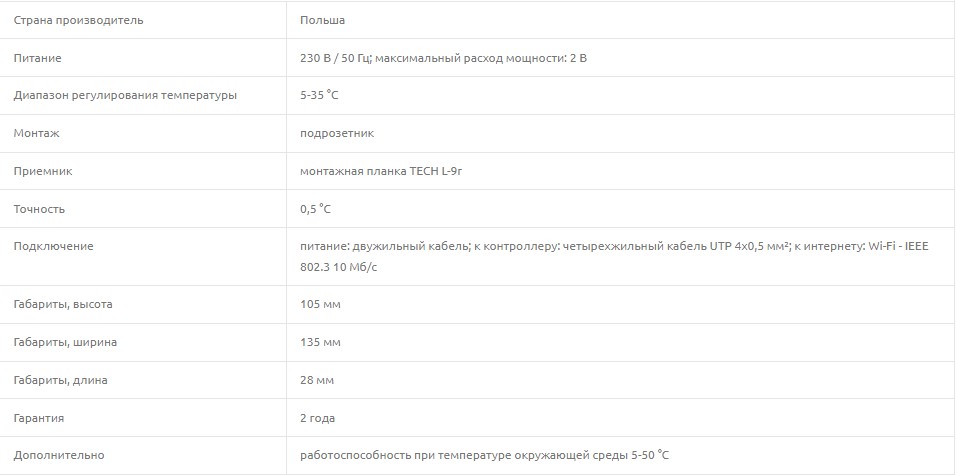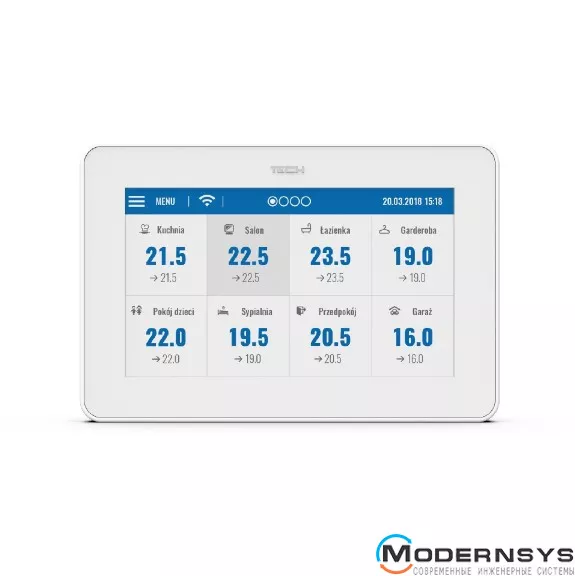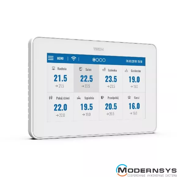 Может регулировать температуру в 32-ух зонах нагрева одновременно. Можно менять параметры для каждой из них, задавать температурный график – устанавливать необходимую температуру в каждый период времени для каждого отдельного дня недели, отключать и включать каждую зону. Имеет компактный и современный вид, легко монтируется в электрической коробке, диаметром – 60 мм и подключается к сети – 230 В / 50 Гц. Управление работой панели, осуществляется с помощью большого сенсорного дисплея с подсветкой, яркость которой устанавливается отдельно для дня и ночи. В панели встроенный интернет-модуль с Wi-Fi связью, с помощью которой Вы сможете управлять температурой, при помощи компьютера или смартфона, с любой точки мира.