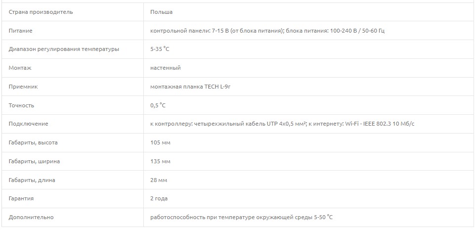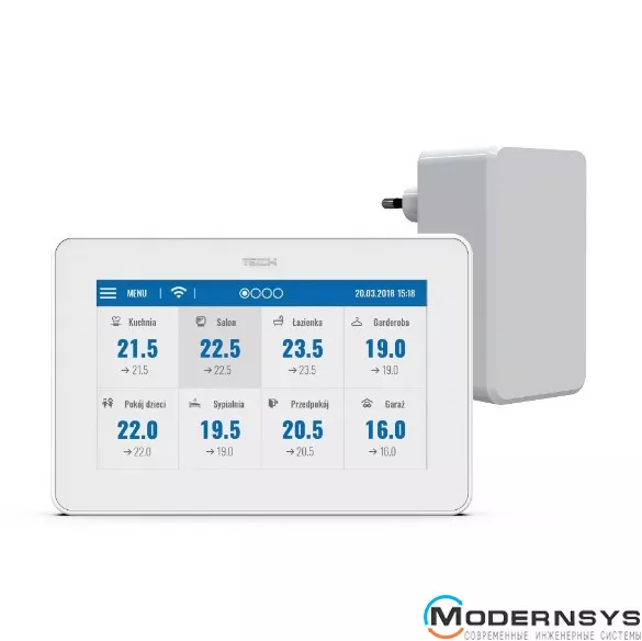 Адаптер питается от сети – 230 В / 50 Гц. Управление работой панели, осуществляется с помощью большого сенсорного дисплея с подсветкой, яркость которой устанавливается отдельно для дня и ночи. В панели встроенный интернет-модуль с Wi-Fi связью, с помощью которой Вы сможете управлять температурой, при помощи компьютера или смартфона, с любой точки мира.