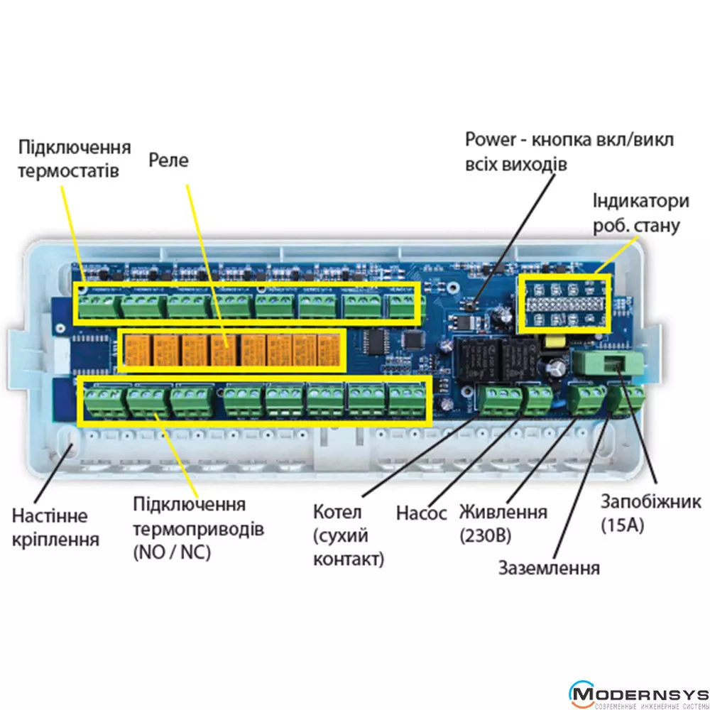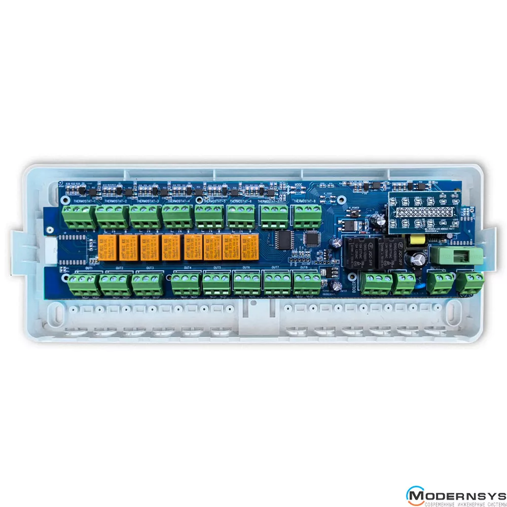 Контроллер управляет термоприводами, установленными на распределительную гребенку теплого пола, а также имеет возможность выключить котел и циркуляционный насос, когда выключены все обогревательные зоны.