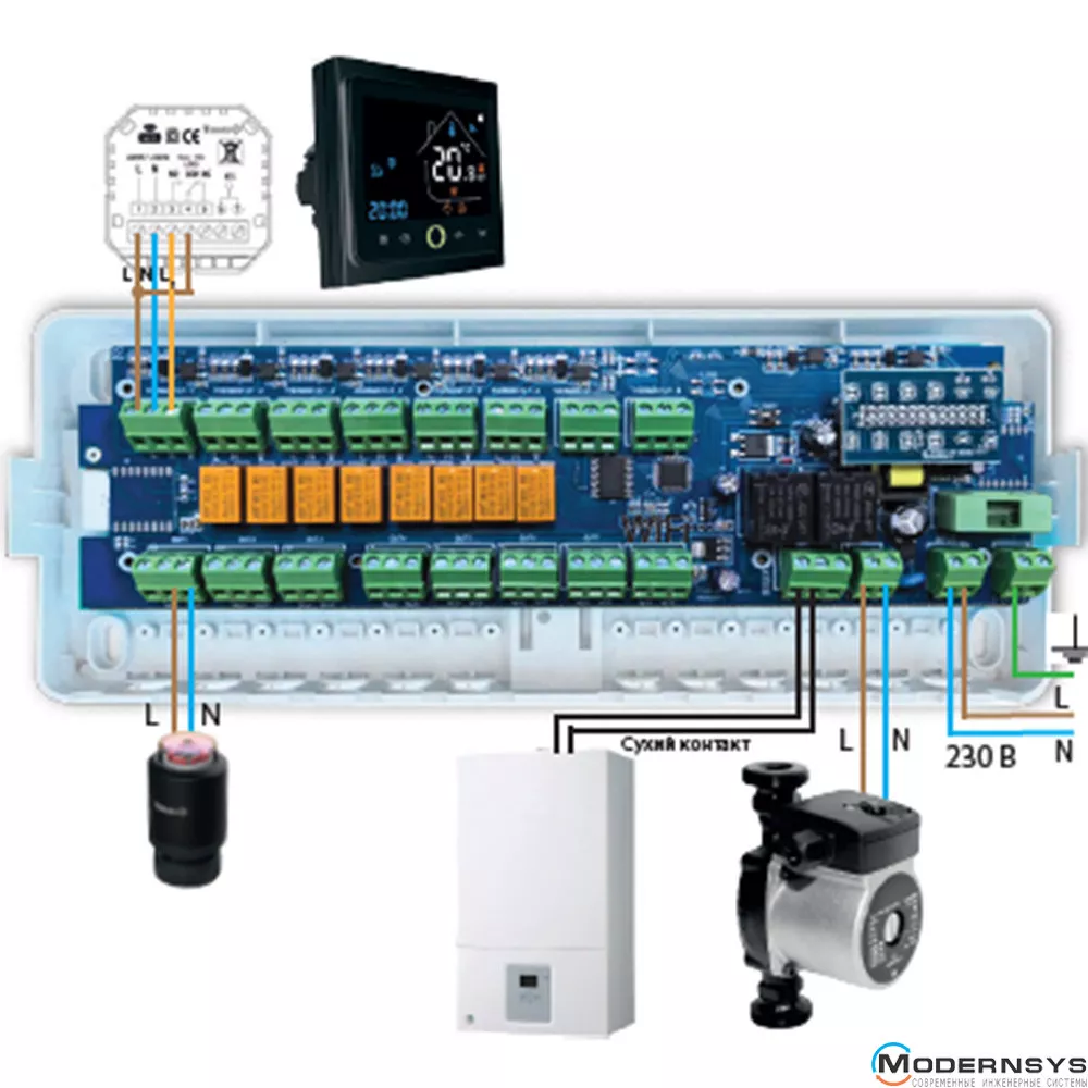 Работает с комнатными термостатами Tervix с WiFi или ZigBee управлением и термоприводами Tervix нормально закрытыми (NC) или нормально открытыми (NO) при напряжении 230В.