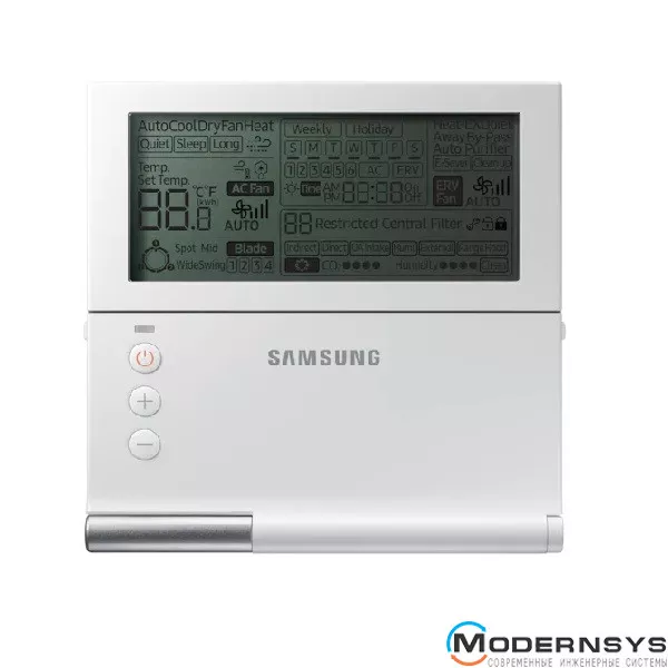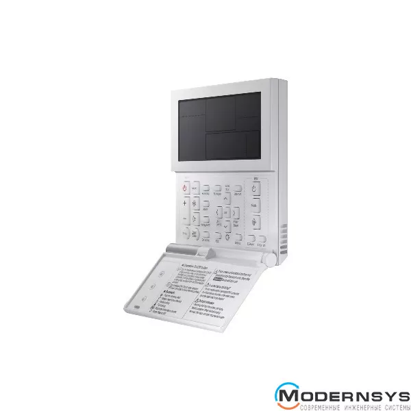 Проводной пульт дистанционного управления Samsung MWR-WW00N с ЖК-экраном и термостат составляют единую систему, подключенную к оборудованию, позволяющую настроить работу всей установки.
