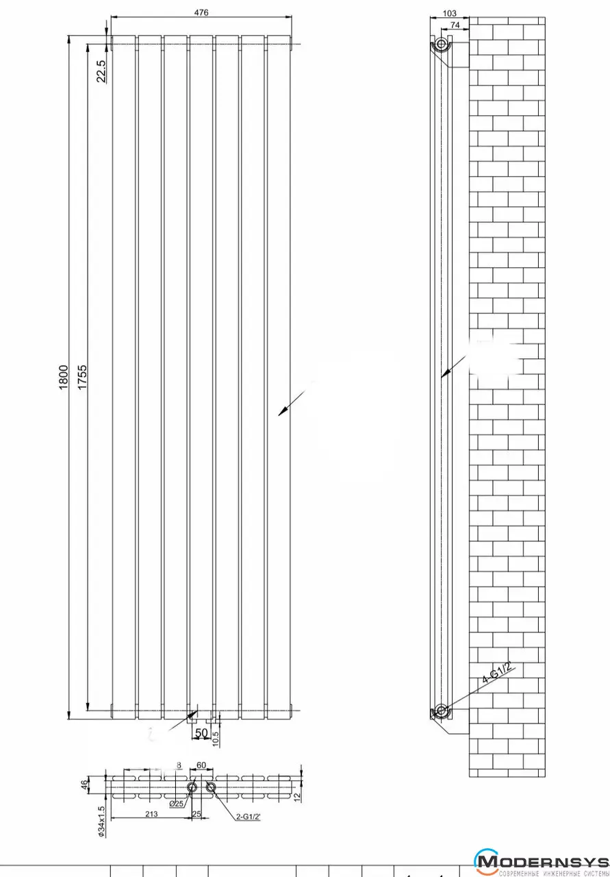 Технические характеристики: Радиатор ARTTIDESIGN (Арттидизайн) Livorno II 7/1800/476/50 серый матовый вертикальный дизайнерский
