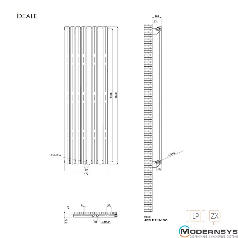 Технические характеристики: Радиатор дизайнерский Ideale Adele 11 8/1500/472 черный
