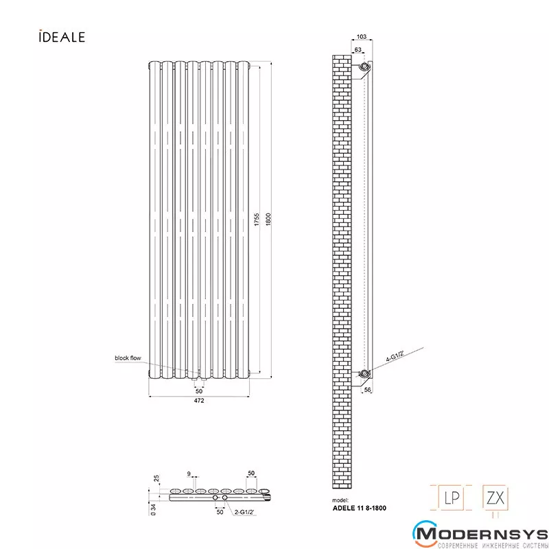 Технические характеристики: Радиатор дизайнерский Ideale Adele 11 8/1800/472 черный