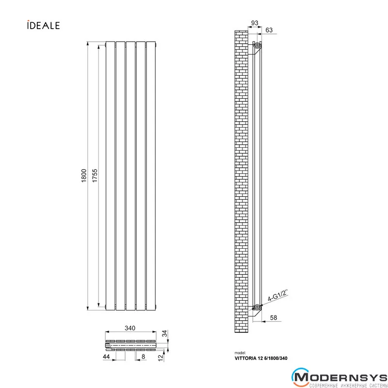 Технические характеристики: Радиатор дизайнерский Ideale Vittoria 12 5/1800/340 белый