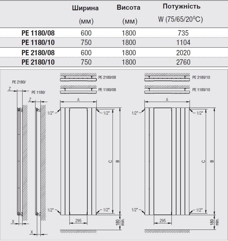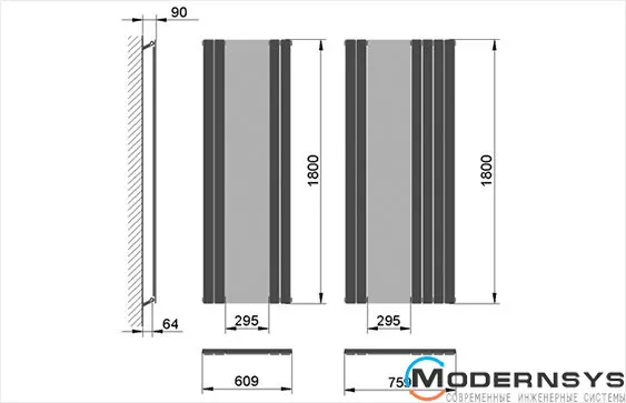 Радиатор производится только одной высоты 1800 мм, и два варианта по ширине 609 и 759 мм. Радиатор состоит с вертикальных плоских пластин и зеркала по центу в модели с шириной 609 мм, и немного смещённое влево в модели 759 мм, что позволяет больше уместить вещей как у ванной комнате или прихожей.