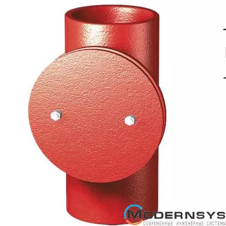 Чугунная ревизия имеет вид тройника, одно из отверстий которого находится в центре и закрывается крышкой. Два других - предназначены для монтирования изделия в систему. Присоединение производится при помощи стальных хомутов с уплотнителями.