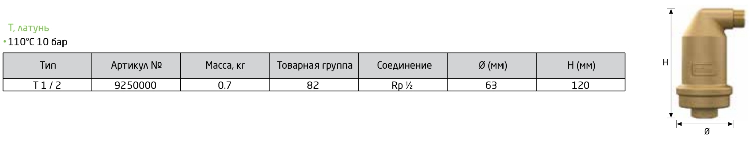 Технические характеристики: Сепаратор воздуха Reflex (Рефлекс) Exvoid T 1/2 латунь