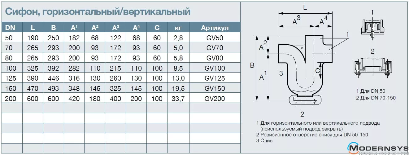 Технические характеристики: Сифон из литейного чугуна горизонтал./верт. SML DN125мм RSP (РСП) GV125