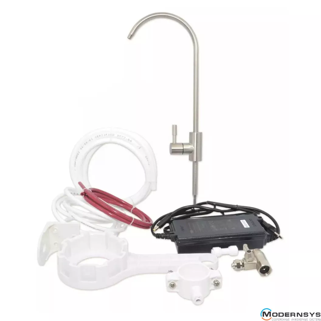 Система состоит из: 4 степени очистки (механический фильтр, угольный фильтр, мембрана, постфильтр), насос повышения давления, кран + монтажный набор.