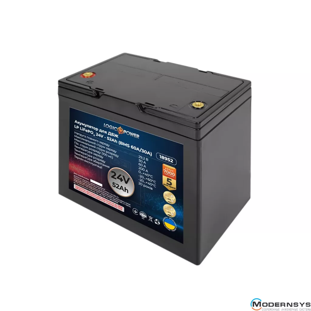 - Аккумулятор LP LiFePO4 Аккумулятор LP LiFePO4 24V - 52 Ah (BMS 60A/30A) пластик - 1 шт.