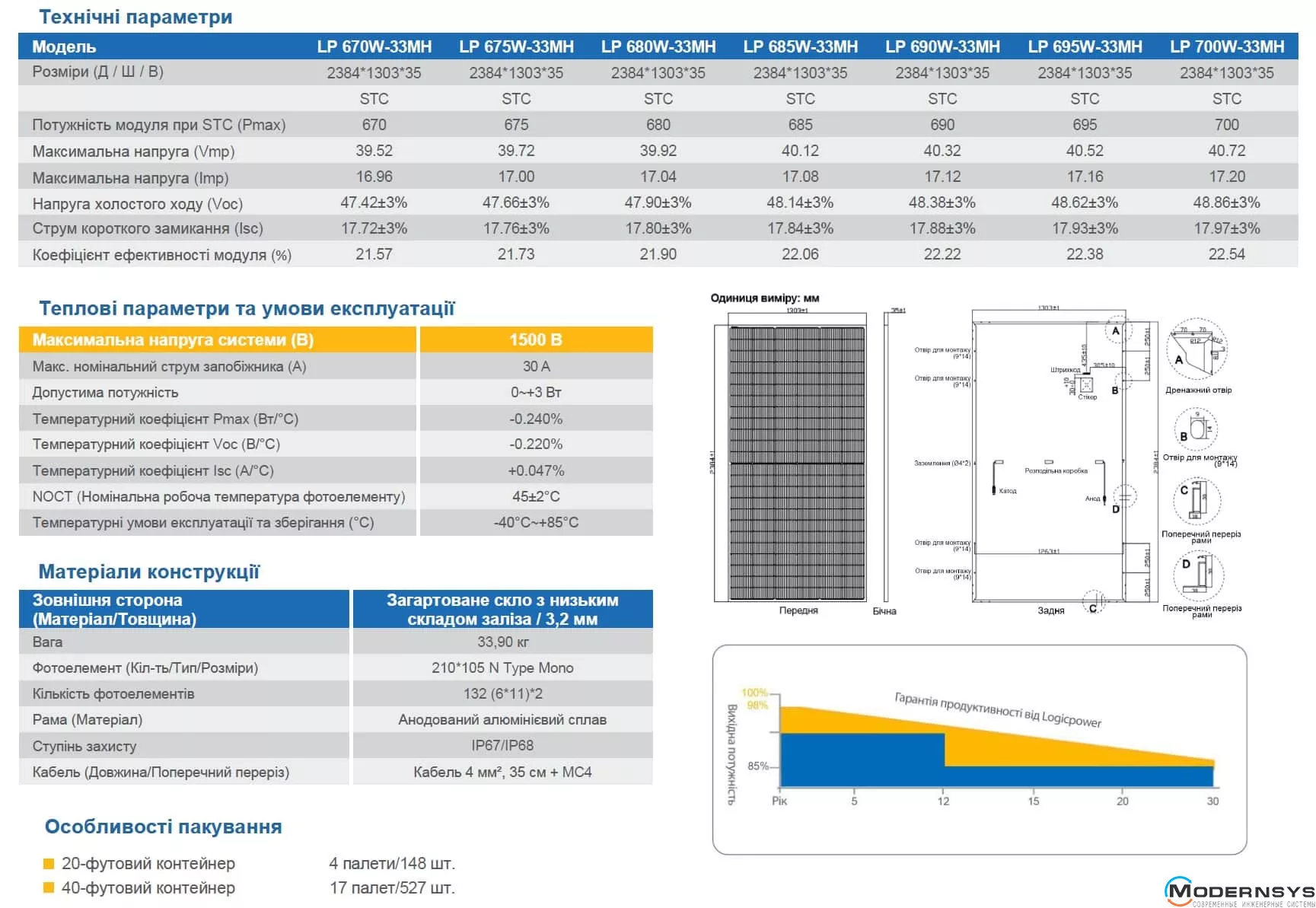 Технические характеристики: Солнечная панель LogicPower (Лоджик Повер) Longi Solar Half-Cell 700W (35 профиль, Topcon N монокристалл)